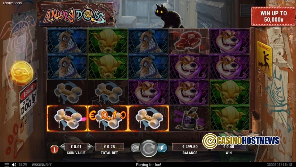 Angry Dogs adopts a gritty, urban aesthetic set within dark city alleyways, moving away from the more common colorful depictions of canine-themed slots. The visual design utilizes high-contrast lighting to highlight “razor-sharp teeth” and bioluminescent elements, creating a tense atmosphere. The sound design complements this setting with a low-frequency ambient score that transitions into more aggressive, rhythmic sequences during the Mystery Doghouse reveal phases.