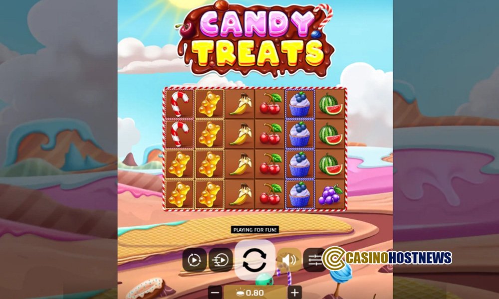 Candy Treats immerses players in a high-definition confectionery landscape, featuring chocolate bar-styled reels framed by vibrant sugar-coated borders. The visual presentation is characterized by polished icons including Candyfloss Scatters, Rainbow Cake Wilds, and various colorful sweets like cupcakes and gummy bears. The atmospheric design is upbeat and playful, designed to provide a bright, energetic backdrop for the 6-reel gameplay.