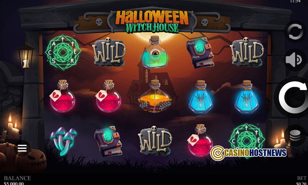 Halloween: Witch House is set in a haunted forest environment, focusing on the exterior of a mysterious cottage. The visual presentation utilizes high-quality 2D animations, featuring thematic icons such as bubbling cauldrons, black cats, and spellbooks to establish a somber, spooky aesthetic. The sound design is atmospheric, intended to build tension during the base game and shift toward a more frantic pace when the Witch or Witch’s House symbols appear on the reels.