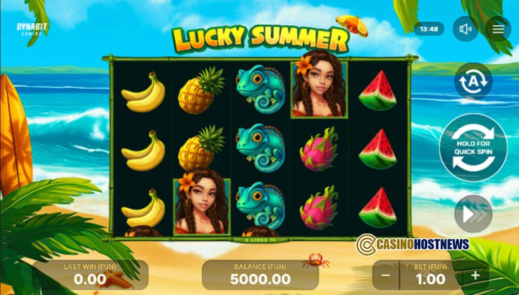 Lucky Summer is a tropical-themed title designed to evoke a relaxed, seaside environment. The visual presentation features vibrant colors, sandy beaches, and tropical fruits, anchored by character-driven symbols like the Chameleon and the Girl. The atmosphere is professional yet lighthearted, providing a consistent “holiday” aesthetic supported by broad localization across 24 different languages and regions.