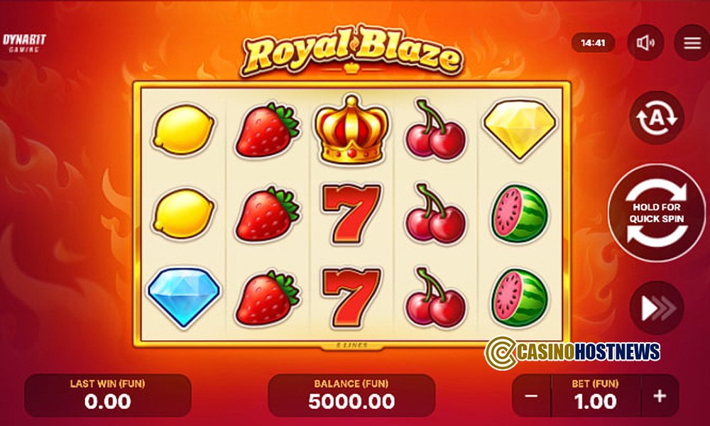 Royal Blaze occupies a niche that Dynabit Gaming describes as the “Golden Age” of slots, utilizing vintage iconography such as fruits and crowns. The visual presentation is professional and polished, characterized by a “fresh, fiery look” that elevates the simple theme into a more contemporary aesthetic. The atmospheric focus is on “sharp and fast” action, designed to keep the player’s attention on the reel movement rather than cinematic interruptions.