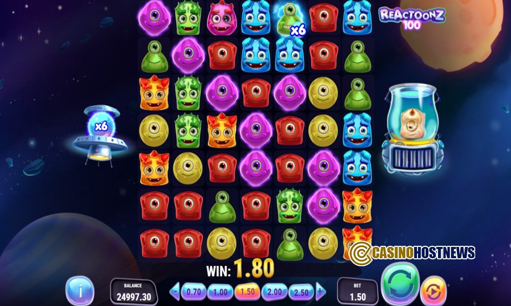 Reactoonz 100 maintains the high-energy, sci-fi aesthetic of the original franchise, depicting a cosmic environment populated by various multi-eyed extraterrestrial lifeforms. The graphical interface utilizes vibrant neon colors and fluid, plasma-like animations that activate during the filling of the Quantum Meters. The sound design is electronic and fast-paced, incorporating quirky synthesized vocalizations from the “Toonz” and increasing in intensity as the Gargantoon prepares to descend onto the grid.