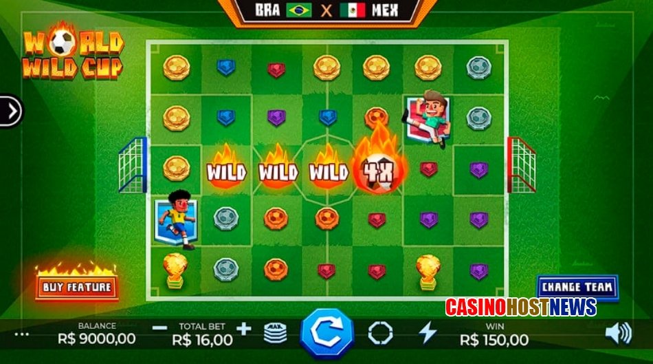 World Wild Cup is set within a stadium environment, capturing the energy of a global football tournament. The visual design focuses on high-contrast colors and fluid animations, particularly during the “Flaming Ball” sequences where fire effects dominate the grid. The soundscape complements the theme with ambient stadium noise and rhythmic audio cues that intensify during the Free Spins Championship.